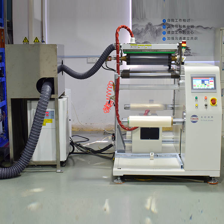 將高壓高頻電流施加于水平放置的放電電極上,在電極之間產(chǎn)生細(xì)小密集的藍(lán)紫色火花使空氣電離,這些空氣電離產(chǎn)生的等離子體在強(qiáng)電場的作用下加速并沖擊被處理PET的聚合物表面,而等離子體粒子的能量可以誘導(dǎo)化學(xué)鍵斷裂和聚合物表面的分子降解,在表面分子鏈上形成羰基和含氮的極性基團(tuán),使被材料的表面張力明顯增加,而材料表面因強(qiáng)離子沖擊而粗化;協(xié)同效應(yīng)使被處理材料的粘附性明顯改善,同時(shí)實(shí)現(xiàn)對PET材料進(jìn)行等離子表面活化和處理,提高PET的表面能和浸潤能力、粘貼性。